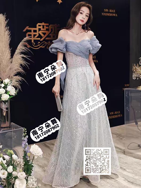 蓝灰一字肩银色裙子女礼服1