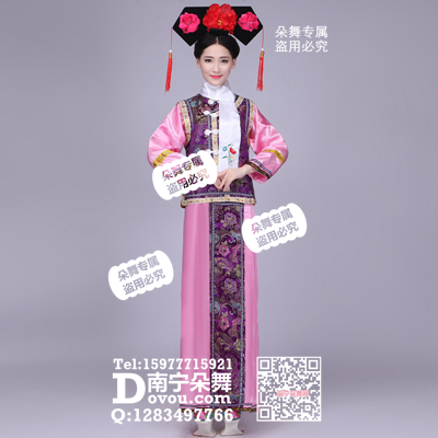 简单描述: 粉红亮面清朝古装还珠格格服装满族女宫女后宫甄嬛传元旦年会表演出服