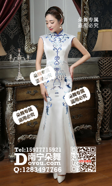 白色蓝花鱼尾旗袍