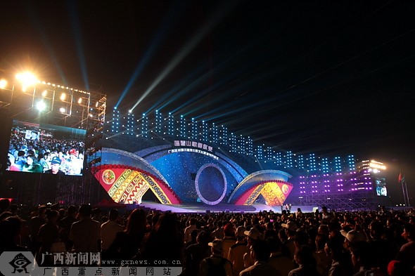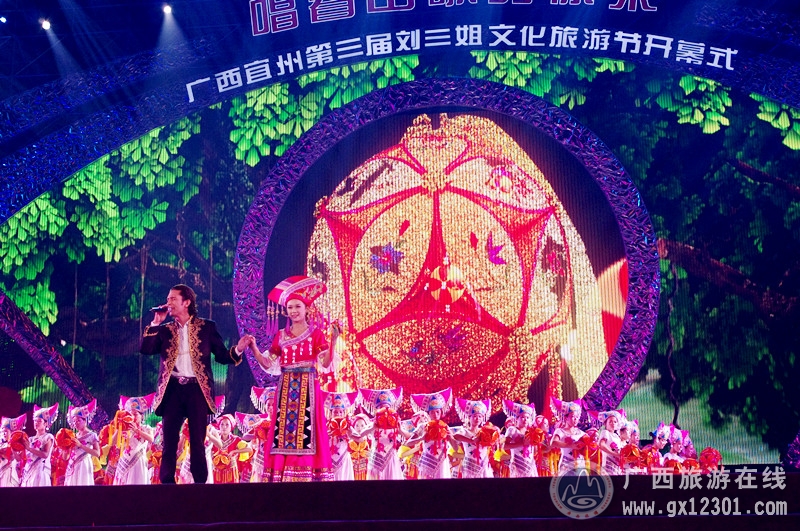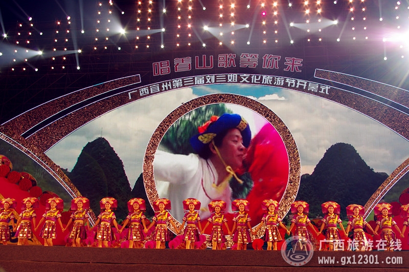 10月12日晚,广西宜州第三届刘三姐文化旅游节开幕式文艺晚会在市民文化公园隆重举行。此次活动以“三姐故乡—唱着山歌等你来”为主题,开幕晚会上,河池市、宜州市、自治区旅游局等相关领导上台致词,并宣布第三届刘三姐文化旅游节正式开幕。随后晚会上进行了精彩的文艺表演,全场一万多名观众激情狂欢,场面热烈。