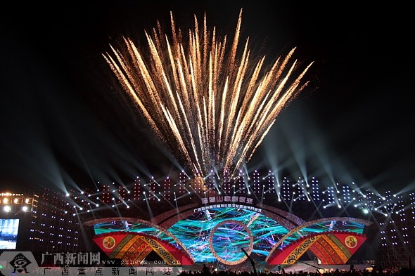 【随着绚丽的烟花划破夜空,主题为《唱着山歌等你来》的开幕式晚会正式拉开帷幕】